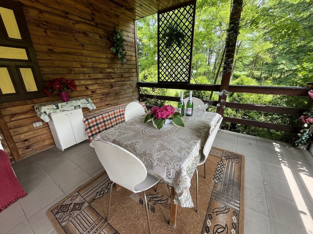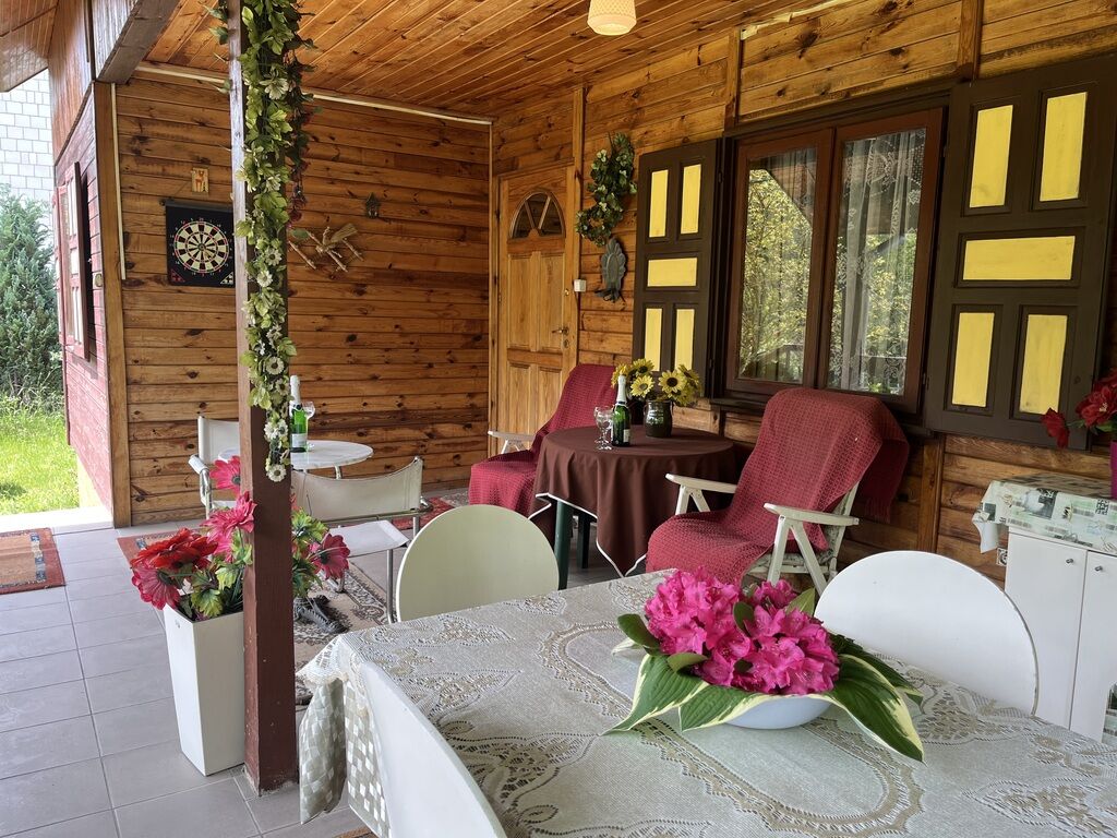 Dom wykonany z drewna o pow. użytkowej 87,5 m2 z dwoma tarasami naogrodzonej pięknej zadbanej działce o pow. 1643 m 2 z bezpośrednim